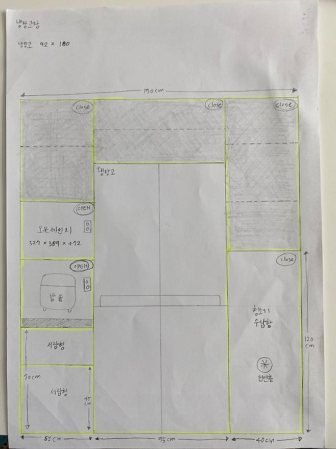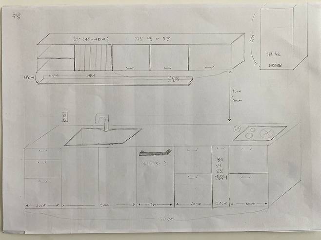 제가 꿈꾸던 주방을 실현 시켜 보려고 열심히 그려본 가구 시안이에요. 조리대는 1자로 만들고 없던 냉장고장은 새로 만들어 넣으면 좋을 것 같다는 생각을 했어요.