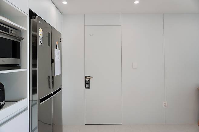주방 쪽 저 벽은 뭐지. 궁금하셨죠.? 저희 집 방 3개 중 유일하게 이 방문을 히든도어로 제작했어요. 거실에서 주방쪽을 바로 보면 보이는 문이기도 하고 히든도어로 하면 깔끔하겠다는 생각에 진행하게 되었네요.