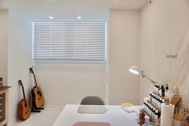 비누나 캔들을 만드는 홈 공방으로 운영되기도 하면서 제 취미 방으로도 쓰이고 있답니다. 테이블은 이케아의 확장형 테이블로 테이블 짧게 두어 쓸 수도 있고 사진처럼 길게 빼두면 6명 정도 앉는 게 가능해요.
