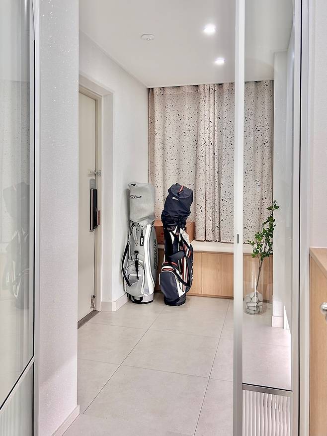 현관 사이즈를 가늠 할 수 있도록 짐이 있는 상태에서 촬영해 보았어요. 골프백을 두 개 세워놔도 넉넉한 사이즈에요. 시공 할 타일은 공간이 좀 더 넓어 보일 수 있도록 밝고 큰 타일을 선택했어요. 타일은 어쩌다 보니 거실 욕실과 같은 제품을 선택하게되었는데요. 같은 제품이어도 조명에 따라 완전 다른 느낌으로 보여요.!