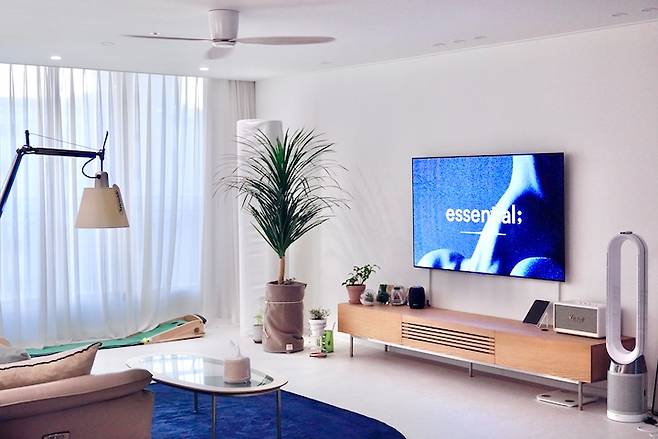 TV장은 이전 집에서 쓰던 제품인데 워낙 견고하고 무난한 원목 가구여서 교체하지 않고 그대로 배치했어요. 지금 집에서도 너무 잘 어울립니다.