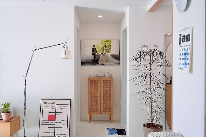 화장실과 작은 방 사이에는 이렇게 전 집과 똑같은 구도로 웨딩 사진과 라탄장을 놓을 수 있는 공간이 있었어요. 이 공간을 볼 때마다 뭔가 첫 집이 생각나기도 하면서 추억이 새록새록 돋아 날 때가 있어요.