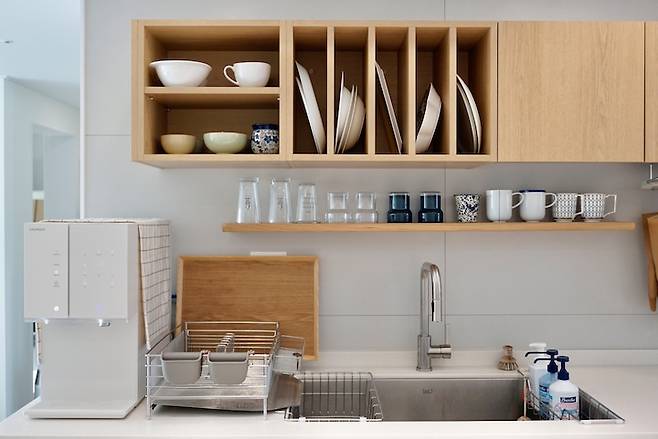 좀 더 가까이서 본 주방 모습이에요. 정수기는 얼음 정수기를 이번에 설치했구요. 저 컵이 놓여져 있는 무지주 선반은 원목으로 제가 따로 제작을 맡긴 제품이라 인테리어 업체에서 설치만 해주셨어요. 색상 차이가 걱정되었는데 다행히 상부장 가구 색상이랑 크게 이질감 없이 잘 어우러졌어요.