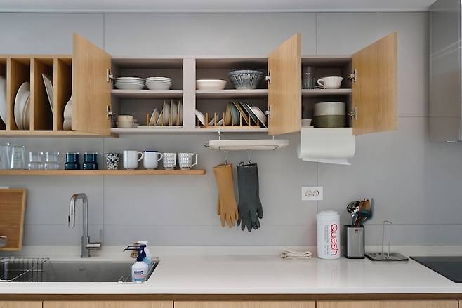 상부장 내부 수납이 궁금하실 것 같아서 열고 촬영해보았는데요. 저는 키가 작은 편이라 상부장이 위쪽까지 길어도 자주 쓰지 못했는데 이번엔 딱 손 닿는 곳까지 상부장이 있어서 이렇게 알차게 쓰고 있답니다. 주방 타일도 제가 직접 보고 골랐는데 600*1200으로 아주 큰 제품으로 선택했어요.