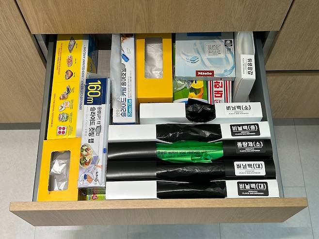 비닐들은 이렇게 정리해 두면 하나씩 뽑아 쓰기에도 좋고 서랍 안 공간 활용이 좋아요.