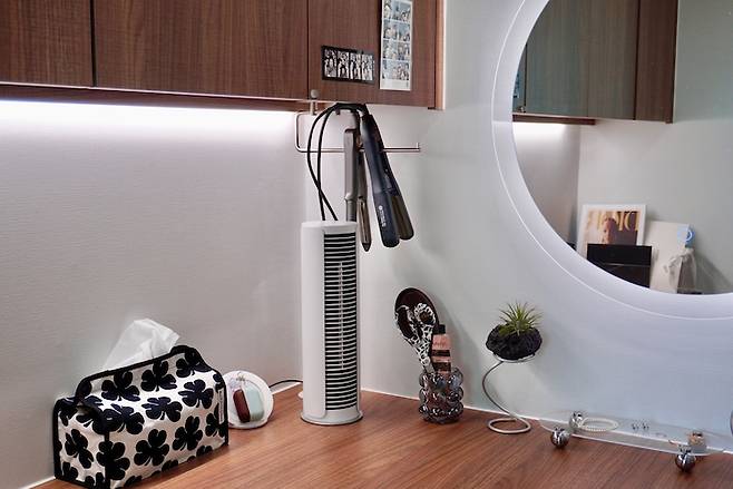 파우더룸이 막혀있는 공간이라 화장할 때 더울 때가 많은데 저 타워형 선풍기가 소음 없이 바람이 솔솔 나오고 회전도 가능해서 너무 잘 쓰고 있어요.