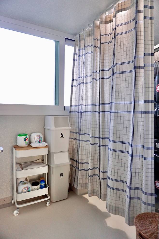 팬트리 반대 쪽은 보일러와 세탁기가 있는 공간이에요. 이쪽은 미운 공간이라 가릴 수 있는 예쁜 커튼을 하나 설치해주었어요. 무타공으로도 튼튼하게 잘 매달려있습니다! 커튼 안쪽은 버려야 하는 박스 보관, 과일,채소, 쌀 보관 등 그런 용도로 쓰이고 있어요.
