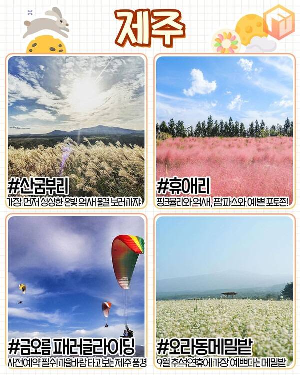 제주 9월 가볼만한 휴애리에서는 핑크뮬리 축제와 감귤체험이 동시에 진행됩니다. 푹신한 핑크빛으로 가득 채워진 들판 곳곳에 포토존이 있어 9월 국내여행의 순간을 오랫동안 간직하기 좋죠. 가을이 다가왔으니 제주도 이색 액티비티 '패러글라이딩'도 빼놓을 수 없습니다.