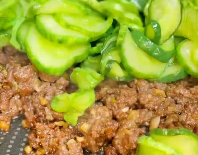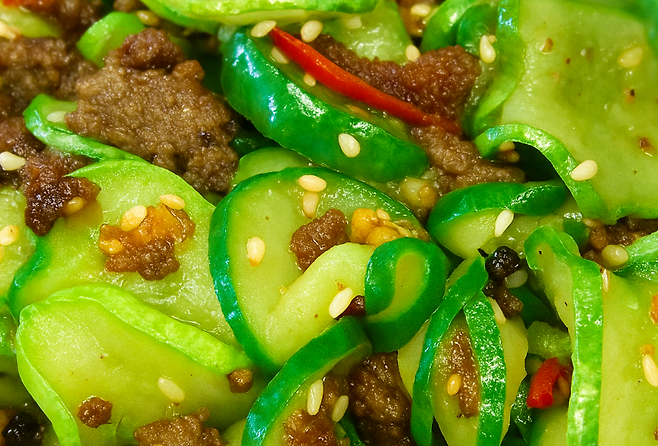 달군 팬에 오이를 먼저 빠르게 볶아 따로 덜어둡니다. 같은 팬에 소고기를 볶다가 익으면 볶아둔 오이를 넣고 함께 볶아주세요.