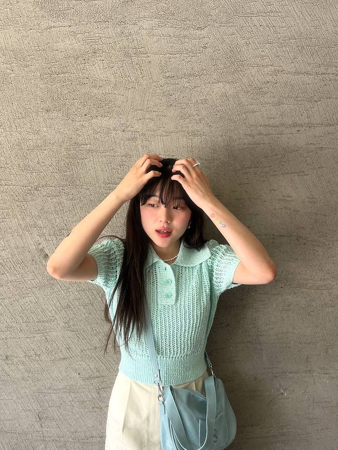 화사한 민트 컬러의 카라 니트는