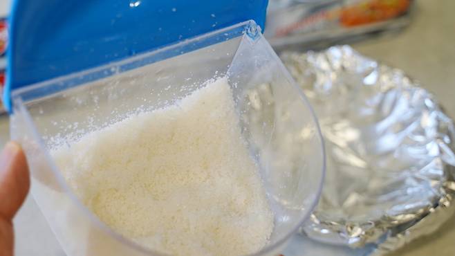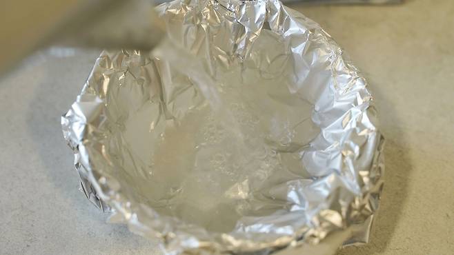 뜨거운 물을 붓고, 소금과 베이킹소다 적당량을 호일에 부어 주었답니다.