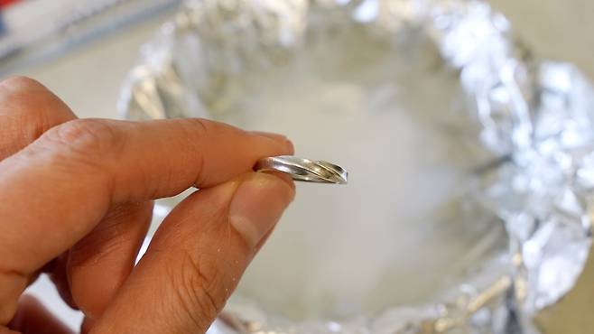 이제 변색된 은 제품을 물에 넣으세요. 저는 반지를 넣어 주었어요. 약 20~30분 정도 그대로 두면 되는데요.
