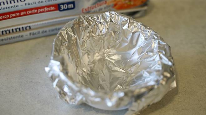 먼저 그릇 하나와 알루미늄 호일을 준비하세요. 그리고 호일 적당량을 잘라 줍니다. 이제 자른 호일을 그릇에 감싸 놓으세요. 이렇게 해야 물이 새지 않고 안정적으로 사용할 수 있는 것 같아요.
