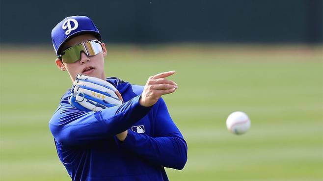 ▲ 미국프로야구 메이저리그(MLB) 첫 시즌을 준비하는 로스앤젤레스 다저스 김혜성이 16일(현지시간) 다저스 스프링캠프가 열리고 있는 미국 애리조나주 글렌데일 캐멀백 랜치에서 캐치볼하고 있다.