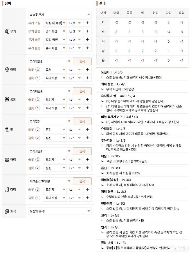 방어 스킬 또한 아무것이나 사용해도 무방한데, 구르기 하나로 모든 공격을 피해야 하는 수렵피리 특성상 회피 성능(회피주)만큼은 어지간해선 착용해 주는 것이 좋다. 그룹 스킬 중 하나인 주인의 긍지는 수렵피리에게 매우 쓸만한 효과지만, 발동시키기 위해 방어구 3개가 강제되므로 취향에 따라 맞추는 것이 추천된다.