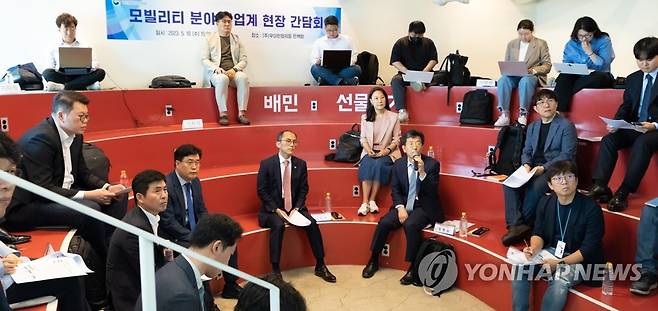 (서울=연합뉴스) 고학수 개인정보보호위원회 위원장이 10일 서울 송파구 (주)우아한형제들 사옥에서 진행된 모빌리티 분야 산업계 현장간담회에서 양청삼 개인정보정책국장의 발표를 경청하고 있다. 2023.5.10 [개인정보보호위원회 제공. 재판매 및 DB 금지]