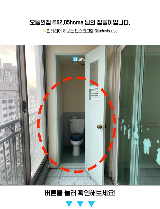처음에 이야기한 없앤 화장실은 이곳입니다. 거실 베란다 쪽에 화장실이 있었어요. 여기에 화장실이 있는 게 저는 너무 놀랍고 신기했는데 예전 집은 많이 그렇다고 하더라고요. 이 공간을 잘 활용하면 아주 좋은 공간이 되겠구나 싶었어요.