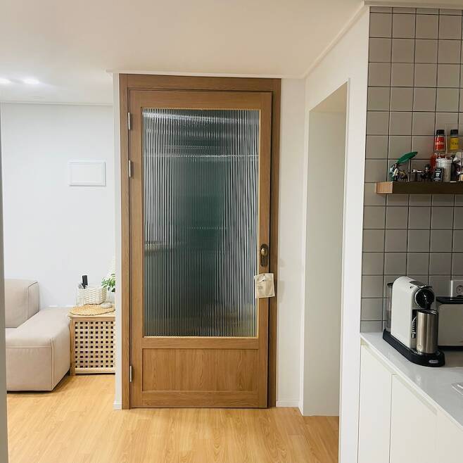 그리고 중문은 보이는 쪽 유리를 모루 유리로 했어요. 풍수지리상 현관문에서 화장실이 보이면 안 좋다고 하더라고요. 요새는 중문을 사선으로도 많이 낸다고 해서 고민했지만 그렇게 하진 않았어요. 아주 잘한 선택 같아요. 모루 유리가 우드랑 같이 있으니 너무 고급스럽게 보이더라고요.