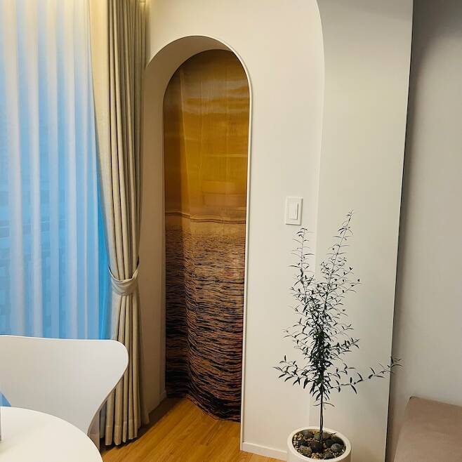 허전해 보였던 소파 옆에는 올리브 나무를 두고, 위에는 액자로 포인트를 주었어요. 거실에 아치 포인트를 많이 해서 이상해 보일까 걱정했는데 너무 예쁘더라고요.