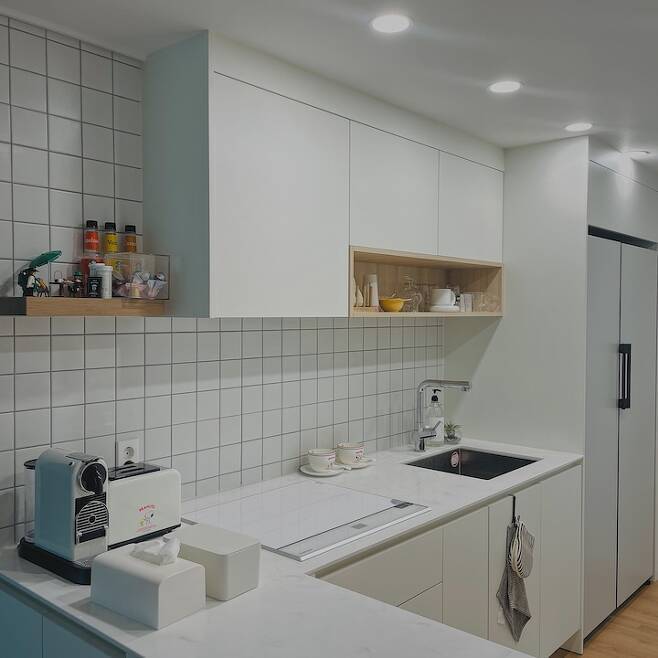 주방은 정말 고민이 많았어요. 다른 곳은 전부 제가 생각한 대로 했지만 구축 24평 아파트의 주방은 냉장고 위치 때문에 너무 어렵더라고요. 베란다를 확장하자니 주방 쪽 베란다에 보일러실이 있어서 할 수가 없었어요.
