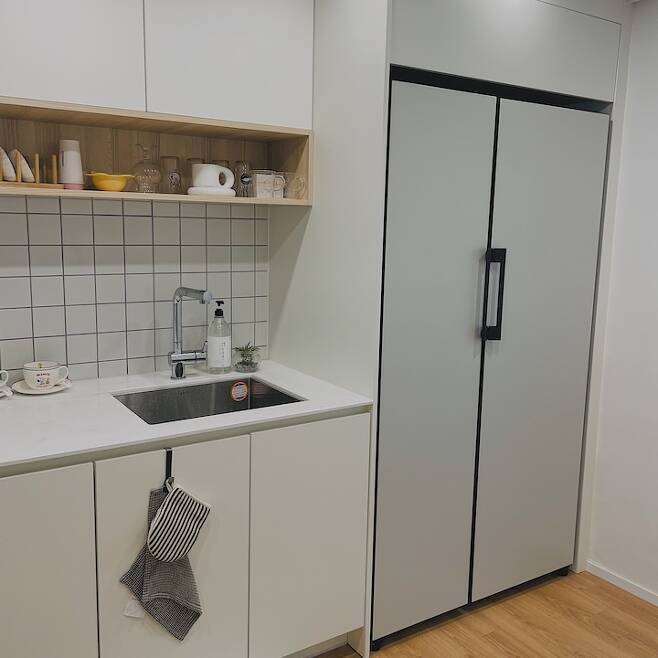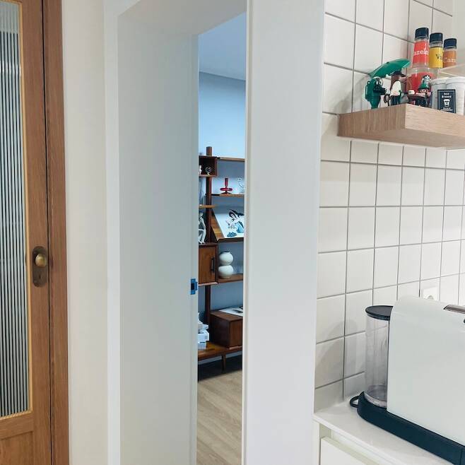 냉장고 사이즈가 생각보다 커서 가벽을 세워 조금 늘렸는데, 아무도 모를 만큼 티가 나지 않아요. 사실 이것 때문에 입구 쪽 방의 문틀이 그만큼 늘어났는데요. 사람들한테 말하면 '아, 그래서 여기 문틀이 넓구나' 하고 다들 잘 모르겠다고 하더라고요.