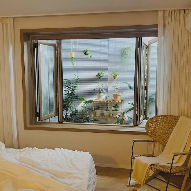 지금은 화분에 진심이에요. 화훼 단지도 가고 인터넷으로 구매하기도 하죠. 처음 화분을 키우지만 화분의 매력에 푹 빠졌어요. 아침에 깨서 창문을 보면 초록 초록 눈이 맑아지는 느낌이에요. 액자 뷰 같은 느낌이 나지 않나요?