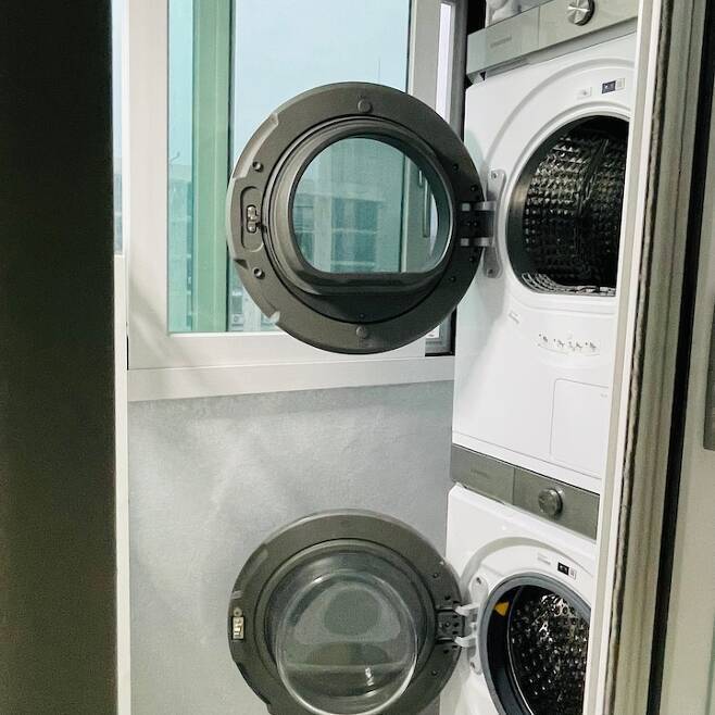 제가 옷이 워낙 많아서, 원래 입구 쪽 방 확장 공사가 끝나면 거기에 드레스룸을 만들려고 했어요. 확장을 하면 그 방이 다른 방보다 좀 더 컸거든요. 하지만 동선상 '침실-화장실-드레스룸-세탁실'이 되는 게 제일 좋을 거 같아, 결국 조금 작긴 하지만 이 방에 드레스룸을 만들었어요. 저는 동선을 제일 중요시해서 그런지 아주 잘한 선택이었어요.
