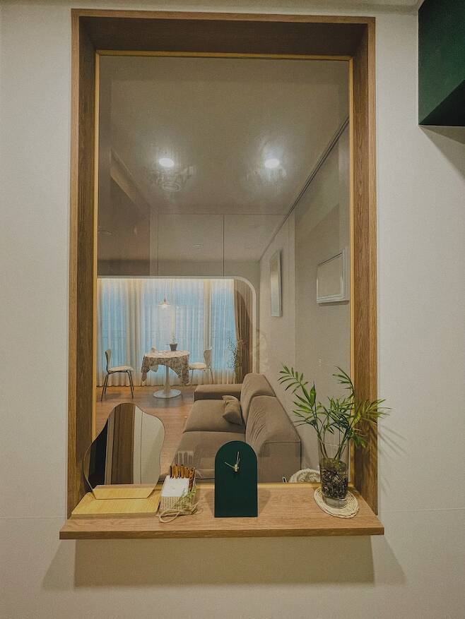 모루 유리를 하니 작은 집이라 너무 답답해 보일 수도 있겠구나 싶었어요. 그래서 가벽 쪽에 창문을 만들어 집에 들어왔을 때 거실이 다 보이게끔 했어요. 창문 아래쪽은 선반처럼 쓸 수 있게 만들어서 수경식물도 올려놓고 신발장에 거울이 없어 작은 거울도 올려두었답니다.