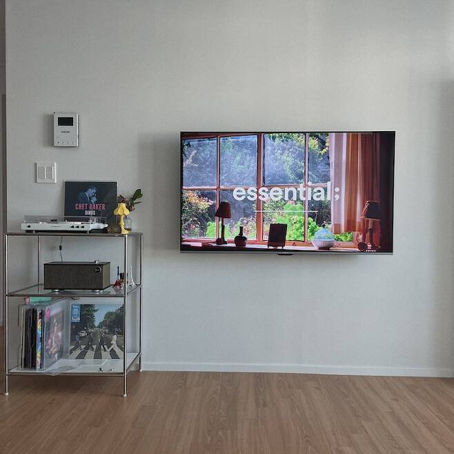 거실을 꾸밀 때는 최대한 깔끔하고, 최소한의 제품만 두려고 했어요. 그래서 거실 장은 하지 않았고 벽걸이 tv를 설치했어요. 또 직접 만든 모듈 선반을 옆에 두고 요새 제일 좋아하는 턴테이블을 두었어요. 집에 들어오자마자 음악을 틀 수 있는 동선이죠.