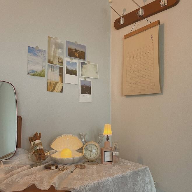 여기는 정말 저만의 공간이에요. 문 열고 들어오면 보이지 않아서 비밀의 공간 같은 느낌이죠. 저에게 가장 필요한 물건들이 있는 공간이기도 해요. 노트북이나 자기 전에 마실 물, 리모컨 등을 올려둬요. 아늑하지 않나요? 러그는 전에 살던 집에서 가져왔는데 공간이랑 너무 잘 맞아요.