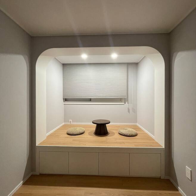 여긴 서재 겸 취미방이자 손님방이기도 해요. 우선 베란다를 확장하고, 그 후에 공간 활용과 가구배치에 대해 엄청 고민했어요. 그러다 전에 포기했던 평상 인테리어를 여기에 하면 딱이겠다 싶은 거예요. 다행히 목공 공사 전이라 가능했어요. 평상을 만들고 수납공간도 잊지 않고 만들어주었어요.