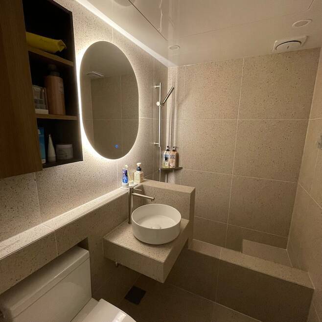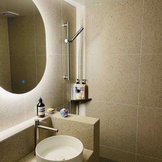 침실에 폴딩도어를 꼭 하고 싶던 것처럼 욕실에는 무조건 조적 욕조를 하고 싶었어요. 오피스텔에 살면서 욕조가 있는 집을 꿈꿔왔거든요. 근데 생각보다 화장실이 좁아서 조적 욕조는 무리라고 하시더라고요. 일반 욕조에 타일을 추천하시기도 했지만 목욕보다는 샤워 시간이 더 많을 텐데 일반 욕조는 불편할 거 같았어요. 조적 욕조를 긍정적으로 생각해 주시는 업체를 선택했고, 이렇게 예쁘게 완성되었어요.
