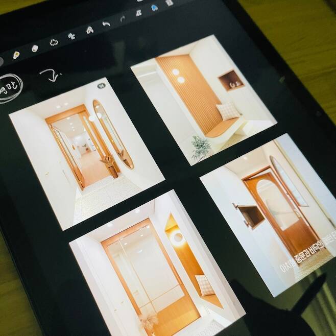 오늘의집을 보면서 캡처하고 스크랩한 사진들을 보니 대부분 화이트&우드 콘셉트더라고요. 그래서 저희 집 인테리어 콘셉트도 화이트&우드로 잡고 전문가에게 상담을 받았어요. 저는 이렇게 파트를 나눠서 태블릿에 저장해놓고 상담을 받았습니다.