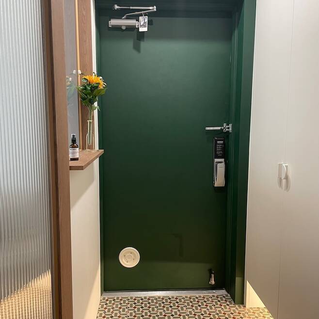 방화문은 딥 그린 필름으로 변경했어요. 그래서 바닥도 타일을 고를 때 화이트, 그린, 우드 색이 들어가 있는 타일로 골라줬어요.