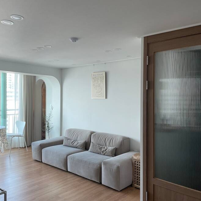 거실은 먼저 베란다 확장공사부터 진행했고 확장된 부분은 아치 모양으로 포인트를 주었어요. 거실의 조명은 전부 매입등으로 해주었어요. 저는 소파 색을 고를 때도 고민이 참 많았어요. 연그레이와 베이지를 고민했는데 저희 집이 화이트에 우드 톤이라 고민 끝에 베이지로 결정했는데 잘한 선택이었어요.