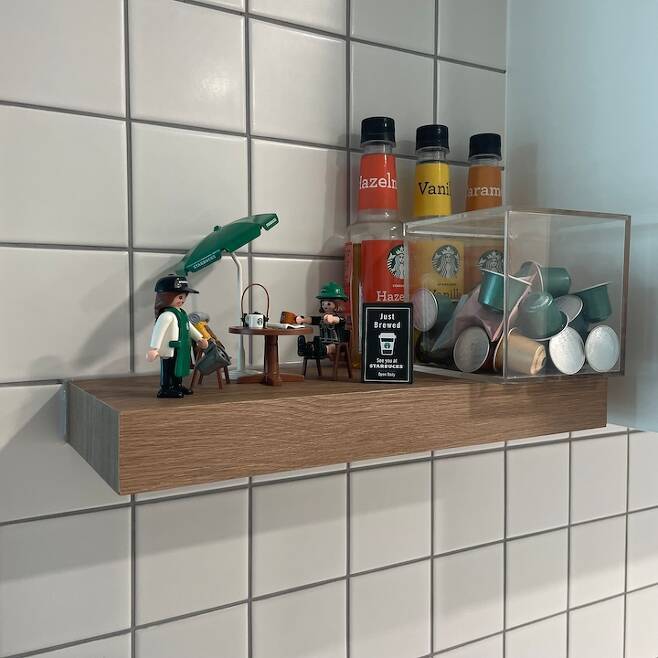선반 하나로 귀여운 홈 카페도 만들었어요. 아주 만족스러운 주방이에요.