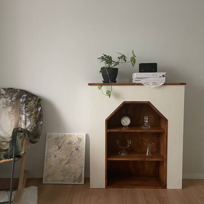 저는 손으로 만드는 것을 좋아해요. 최근에는 목공에 취미가 생겨서 직접 공방에서 만든 벽난로예요. 선반을 빼고 낄 수 있게 만들어 주었어요. 침실 분위기를 더 살려주어서 아주 만족하고 있어요. 아직은 아무것도 없지만 채워지는 공간 기대해 주세요.