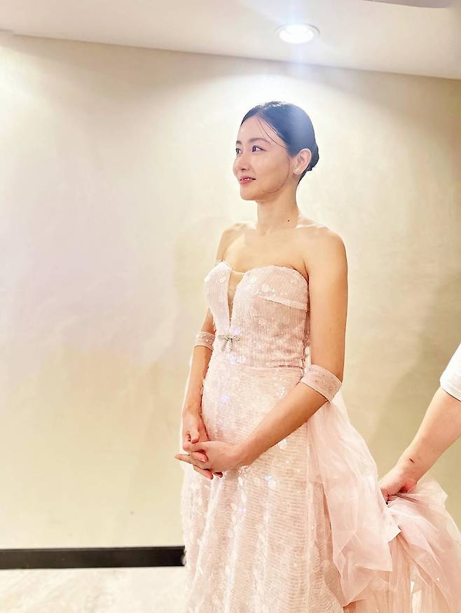 부드러운 조명이 스며든 대기실에서 황우슬혜가 고운 자태로 서 있었다.