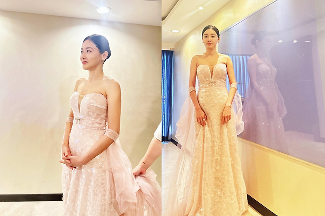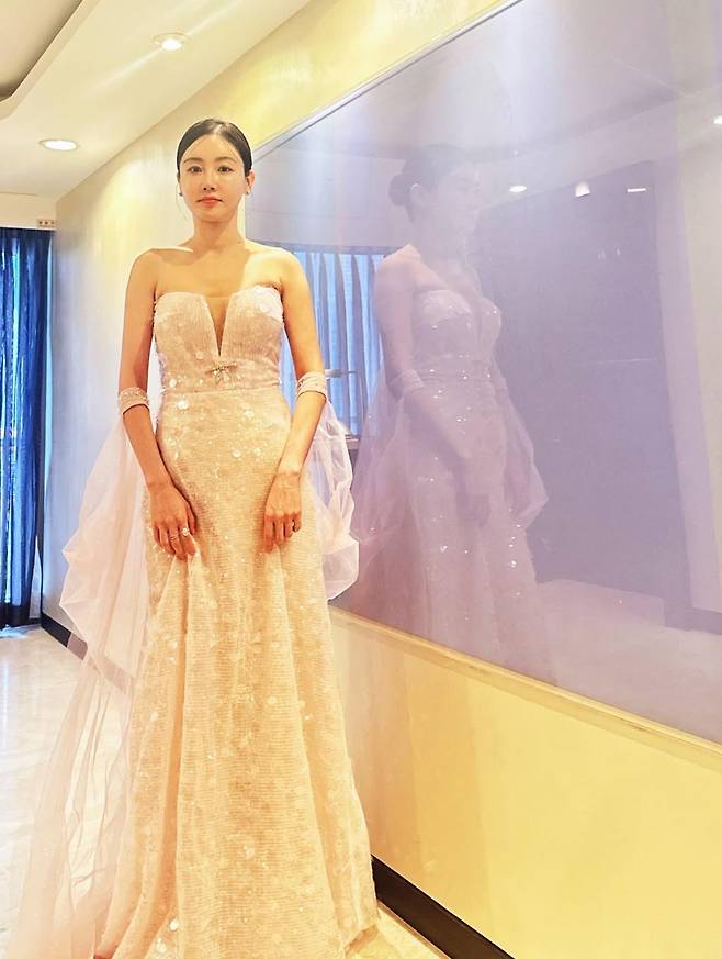 은은히 번지는 드레스의 빛결은 그녀를 한층 더 눈부시게 감싸며, 마치 영화 속 장면처럼 몽환적 순간을 완성했다.