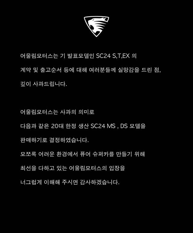 [속보] 최근 부산 벡스코(BEXCO)에서 열리고 있는 '2024 부산모빌리티쇼'에서 계약 및 출고 순서 이슈로 네티즌의 질타를 받았던 어울림 모터스가 5일 자사 공식 SNS채널(@oullim_motors)을 통해 공식 사과문을 게시했다. 어울림모터스는 지난 27일, 12년 만에 신차 '스피라 크레지티 24'를 공개하며 계약 방식을 발표하였는데, "계약금을 많이 넣은 사람"을 우선으로 출고하겠다고 밝혀 소비자들의 반발을 샀다.