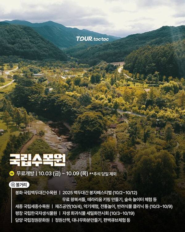 전국 국립수목원 4개소는 2025 추석 연휴 기간 무료개방됩니다. 추석 무료입장 뿐 아니라, 4곳의 수목원에서는 저마다 특색있는 체험 프로그램을 마련하는데요. 경북 봉화 국립백두대간 수목원에서는 '백두대간 봉자페스티벌' 기간이 추석 연휴와 겹쳐 무료 왕복셔틀부터 테라리움 키링 만들기, 숲속 놀이터 체험 등이 펼쳐집니다.