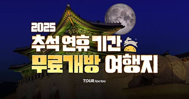 오늘 여행톡톡은 2025 추석 무료 여행지를 총정리해 소개합니다. 연휴기간 내내 또는 추석 당일에만 무료개방되는 곳까지 모두 모아왔는데요. 역대 가장 긴 추석 연휴, 가족과 연인 또는 혼자라도 충분히 무료로 풍성한 한가위를 보내시는 데에 도움이 되길 바랍니다.