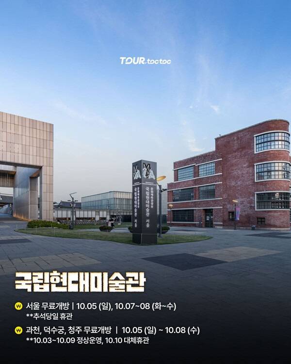 2025 추석 연휴 전국 4개의 국립현대미술관은 무료 개방으로 운영됩니다. 서울 국립현대미술관은 10월 5일과 7~8일, 과천과 덕수궁, 청주관은 10월 5~8일 기간 내 무료로 관람이 가능한데요.