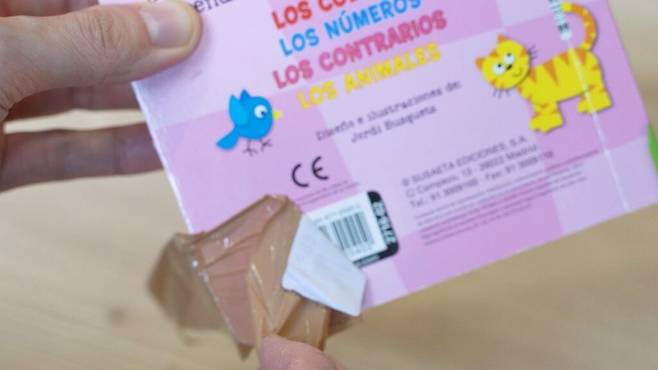 스티커가 유리병이나 책에 붙어서 잘 떼어지지 않을 때도 간단한 방법이 있습니다. 먼저 스티커 위에 테이프를 붙이세요.