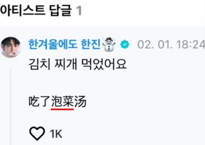 앞서 한진은 지난 1일 팬 커뮤니케이션 플랫폼 위버스(Weverse)에서 한 팬이 "밥 먹었어?"라고 묻자 "김치찌개를 먹었다"라고 답하며, 중국어로 '파오차이(泡菜)'라는 단어를 함께 적었다.