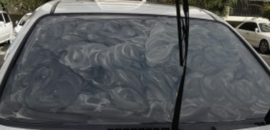 정체: 도로의 아스팔트에서 튄 타르, 앞차의 배기가스에 섞인 기름 성분, 자동 세차기의 왁스 찌꺼기 등이 비와 먼지와 엉겨 붙어 유리 표면에 형성된 얇은 '기름 막(油膜)'.