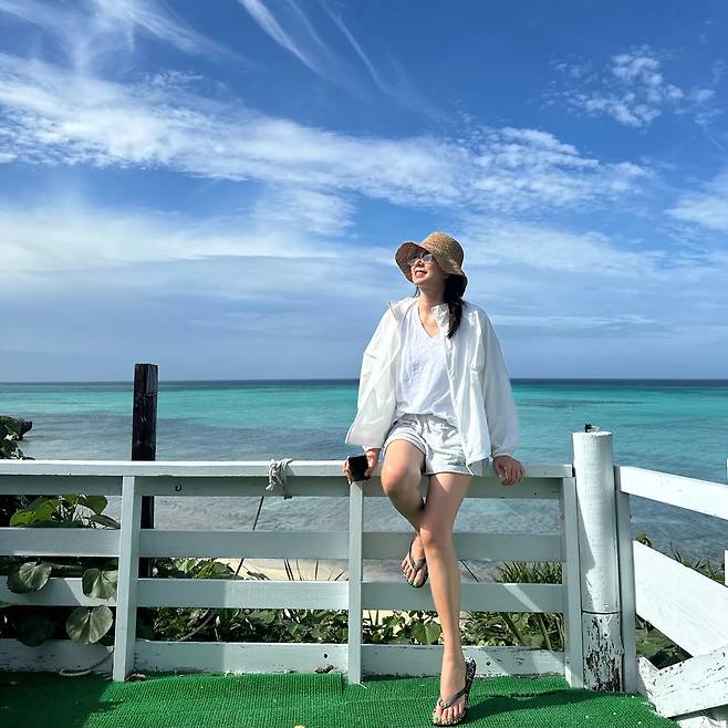 터키석 빛 바다를 배경으로 올 화이트 코디네이션을 완성하고 있다. 오버사이즈 화이트 셔츠와 화이트 쇼츠의 조합에 밀짚모자와 선글라스로 완벽한 비치 룩을 연출했다. 화이트 데크 난간에 앉은 자세로 바다의 푸른빛과 대조를 이루며 청량한 여름 분위기를 자아내고 있다.