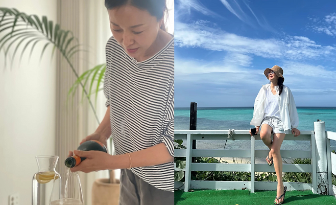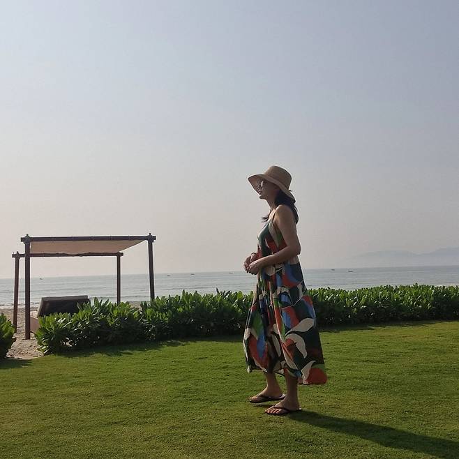 조미령은 해변 리조트에서 컬러풀한 패턴 드레스로 여유로운 휴양지 룩을 연출하고 있다. 다채로운 색상의 기하학적 패턴이 돋보이는 맥시 드레스에 베이지 톤의 와이드 브림 햇을 매치해 세련된 리조트 패션을 완성했다. 플랫 샌들로 편안함을 더하며 바다를 배경으로 한 자연스러운 포즈가 인상적이다.