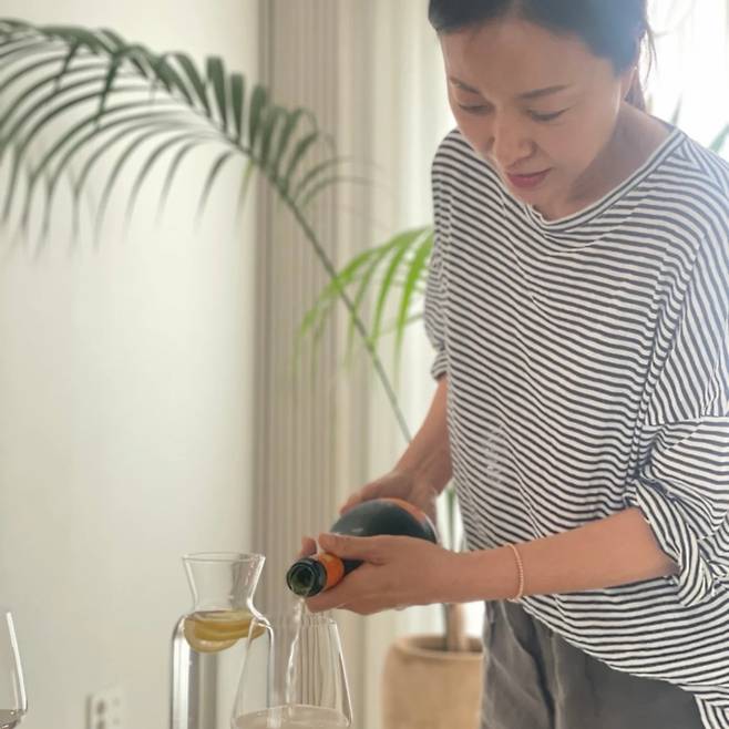 실내에서는 네이비 스트라이프 오버사이즈 티셔츠로 편안한 홈웨어 스타일을 선보이고 있다. 클래식한 스트라이프 패턴의 루즈핏 톱으로 자연스러운 일상 룩을 연출하며, 차를 우리는 모습에서 여유로운 라이프스타일을 엿볼 수 있다.