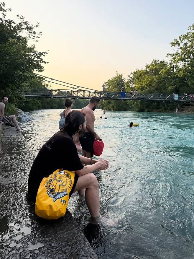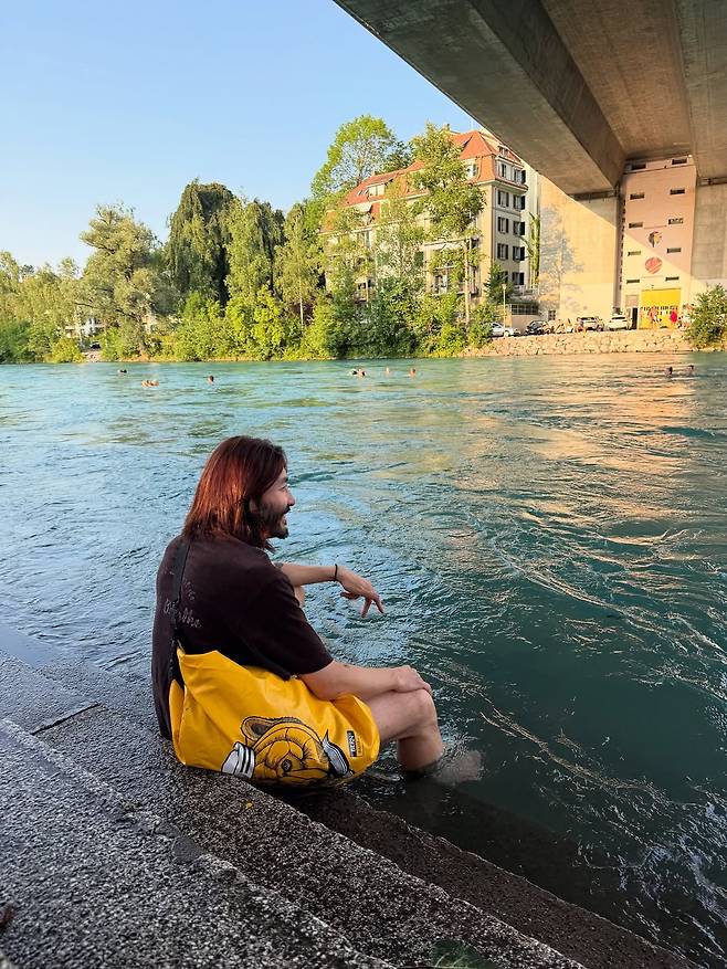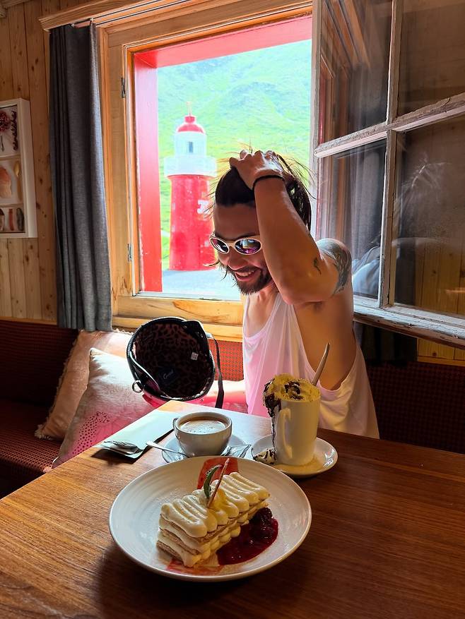 바람에 흩날리는 긴 머리와 컬러풀한 패션, 맨발로 대담하게 호숫가에 앉은 그의 모습은 그야말로 “노홍철표 인생 힐링”의 정석.